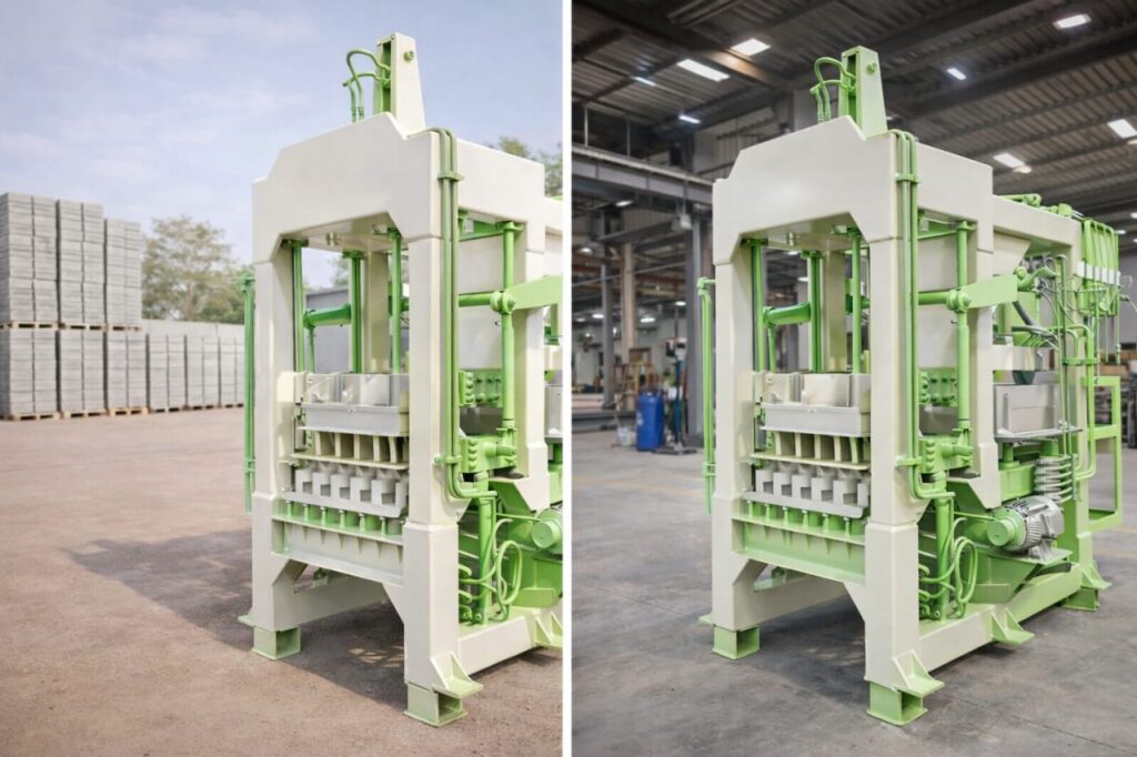 • Heavy-Duty Vibration: SSM machines mein high-frequency vibration motors lagai jati hain jo concrete ko itna compact karti hain ke block ki strength 3000 PSI se ziada ho jati hai.